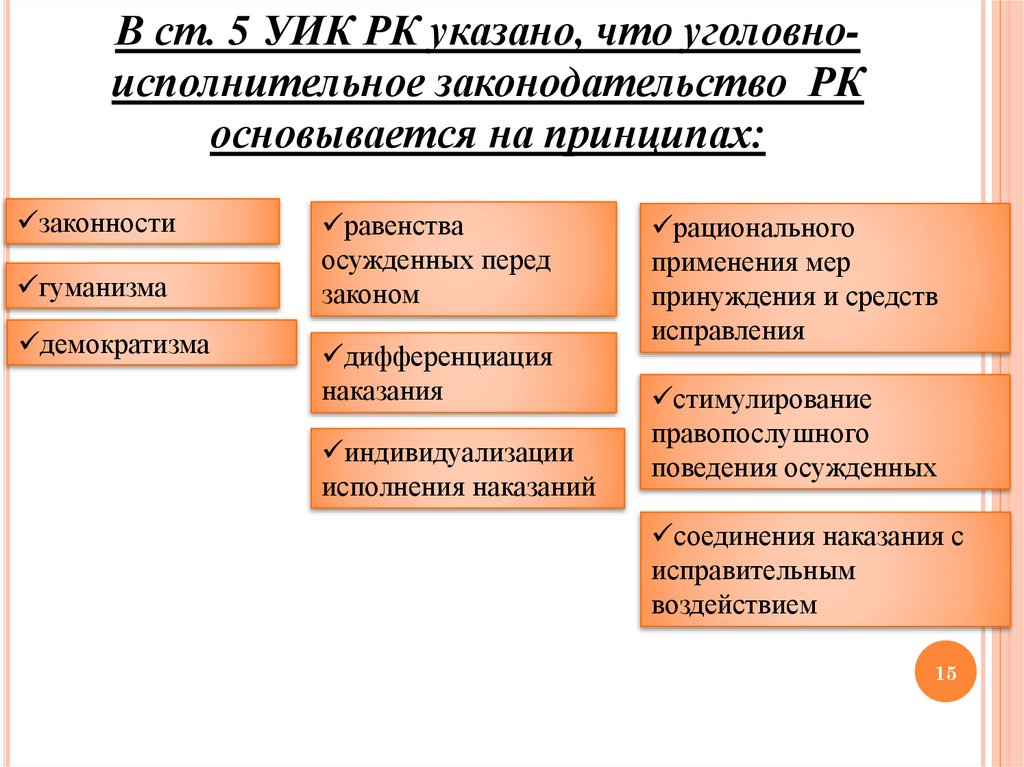 В ст. 5 УИК РК указано, что уголовноисполнительное законодательство РКосновывается на принципах: