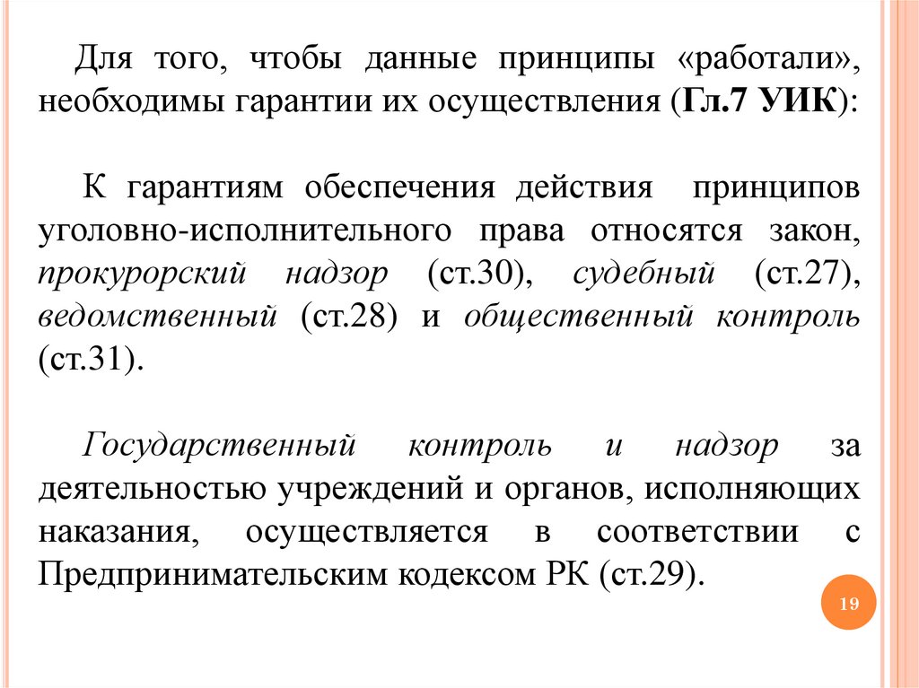 Для того, чтобы данные принципы «работали»,необходимы гарантии их осуществления (Гл.7 УИК):