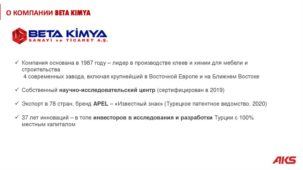 О КОМПАНИИ BETA KIMYAКомпания основана в 1987 году – лидер в производстве клеев и химии для мебели и