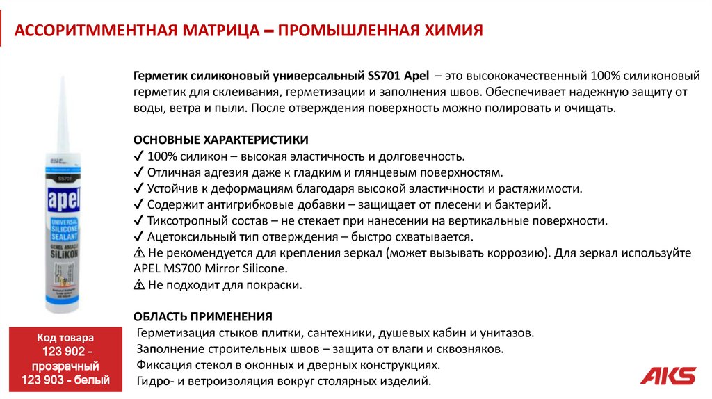 АССОРИТММЕНТНАЯ МАТРИЦА – ПРОМЫШЛЕННАЯ ХИМИЯГерметик силиконовый универсальный SS701 Apel – это высококачественный 100% силиконовый