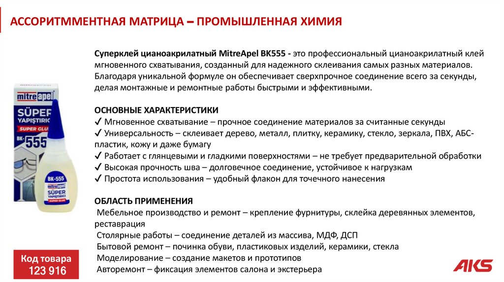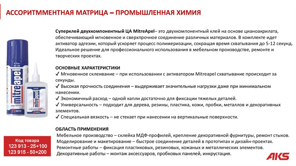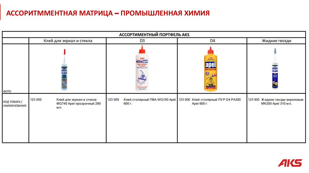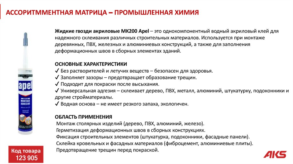 АССОРИТММЕНТНАЯ МАТРИЦА – ПРОМЫШЛЕННАЯ ХИМИЯЖидкие гвозди акриловые MK200 Apel – это однокомпонентный водный акриловый клей для