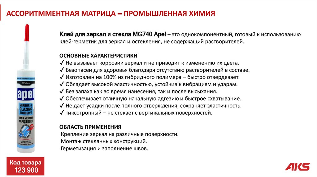 АССОРИТММЕНТНАЯ МАТРИЦА – ПРОМЫШЛЕННАЯ ХИМИЯКлей для зеркал и стекла MG740 Apel – это однокомпонентный, готовый к использованию