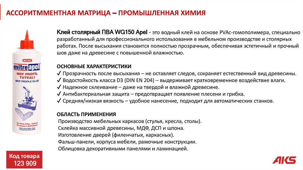 АССОРИТММЕНТНАЯ МАТРИЦА – ПРОМЫШЛЕННАЯ ХИМИЯКлей столярный ПВА WG150 Apel - это водный клей на основе PVAc-гомополимера, специально