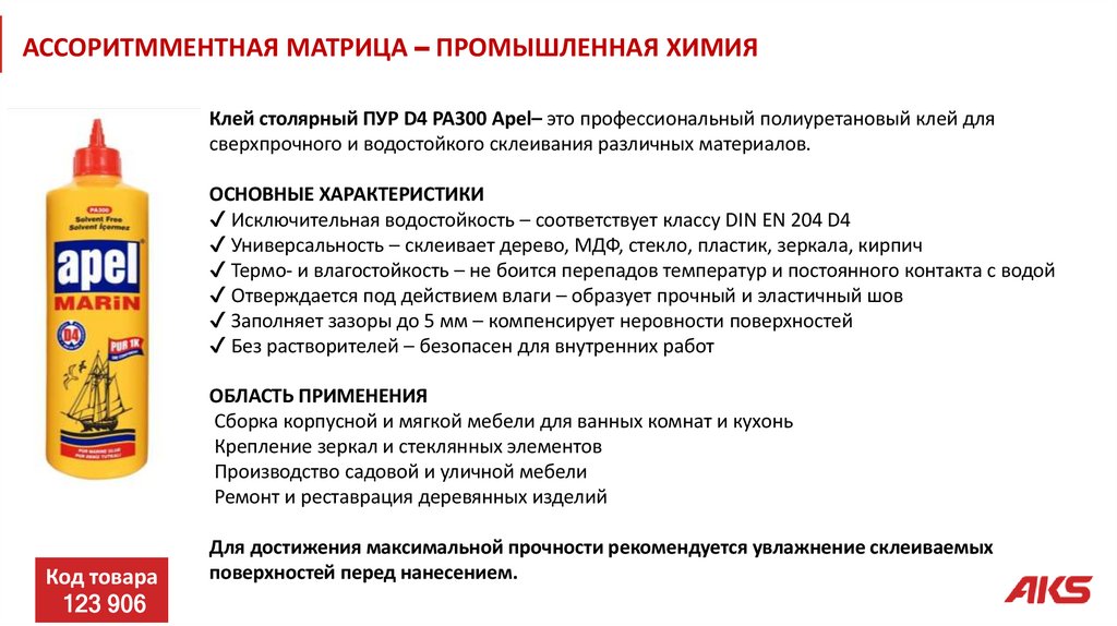 АССОРИТММЕНТНАЯ МАТРИЦА – ПРОМЫШЛЕННАЯ ХИМИЯКлей столярный ПУР D4 PA300 Apel– это профессиональный полиуретановый клей для