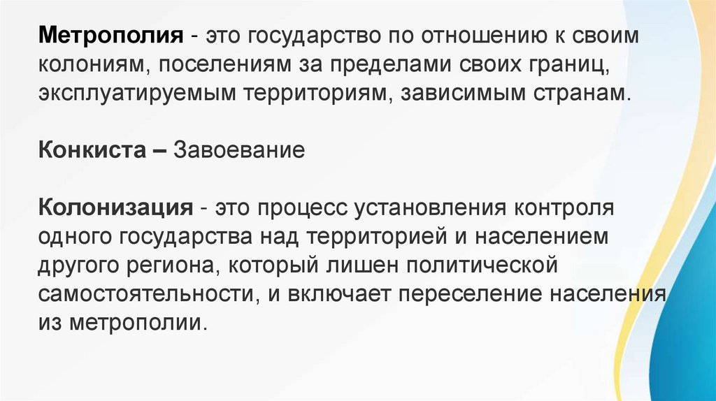Метрополия - это государство по отношению к своимколониям, поселениям за пределами своих границ,