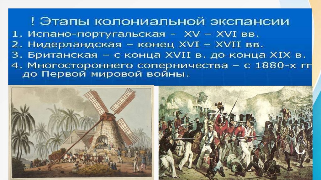 • Эпоха открытий и колониальные завоевания привели кобразованию первых колониальных империй, значительно