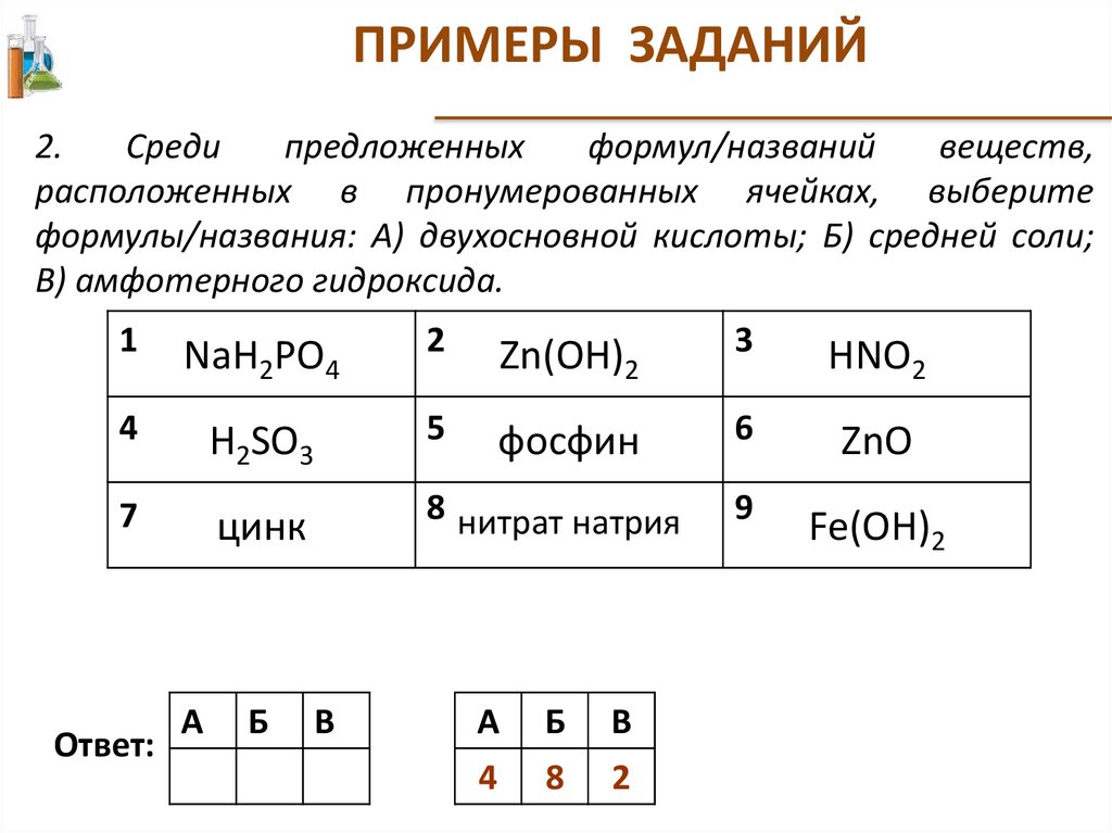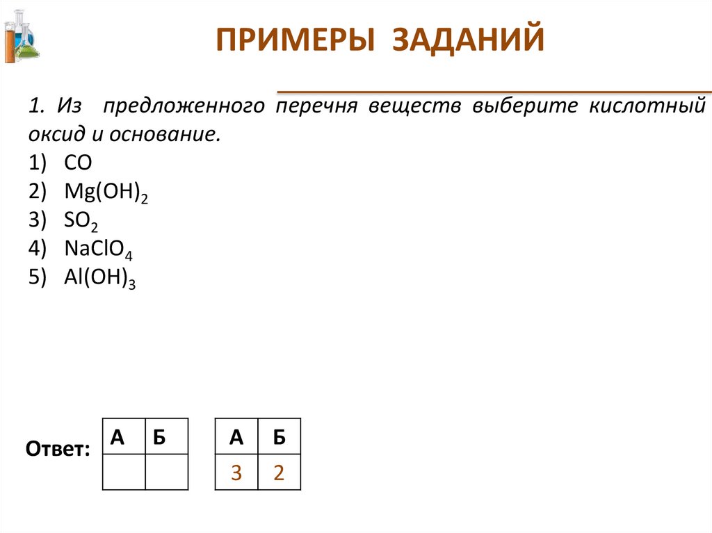 ПРИМЕРЫ ЗАДАНИЙ1. Из предложенного перечня веществ выберите кислотный