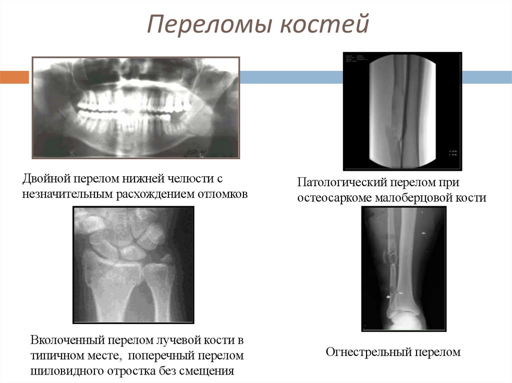 Рентгенологические признаки переломов:Линия перелома - нарушение целости костной ткани в виде