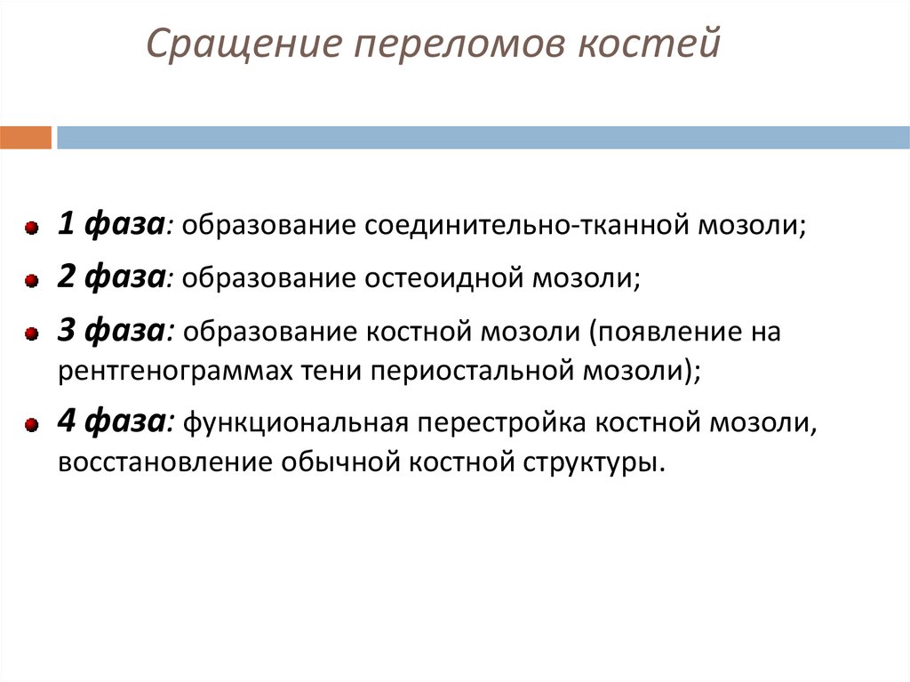 Сращение переломов костей1 фаза: образование соединительно-тканной мозоли;