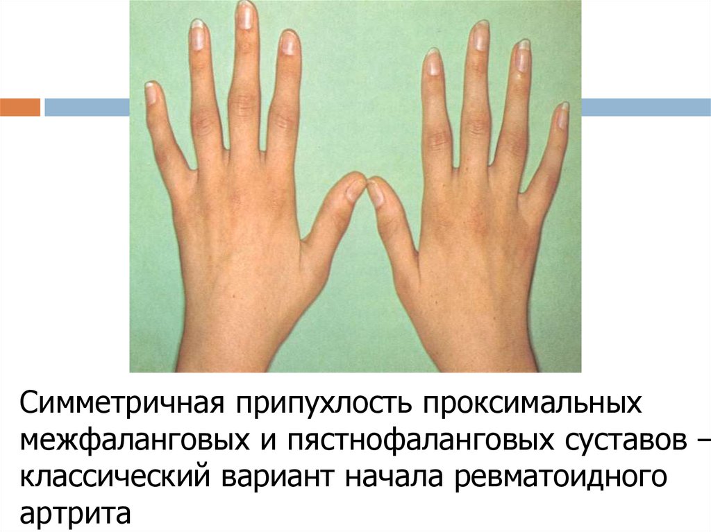 Симметричная припухлость проксимальныхмежфаланговых и пястнофаланговых суставов –