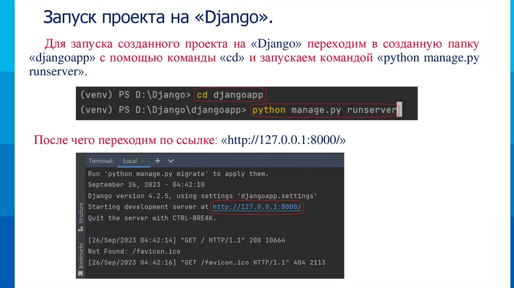 Запуск проекта на «Django».Для запуска созданного проекта на «Django» переходим в созданную папку
