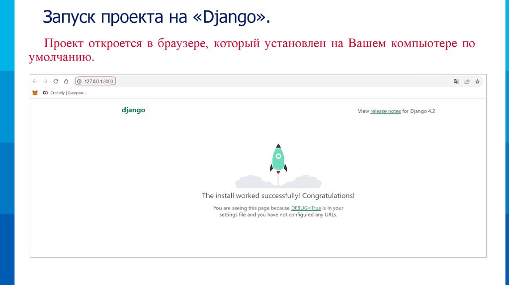 Запуск проекта на «Django».Проект откроется в браузере, который установлен на Вашем компьютере по
