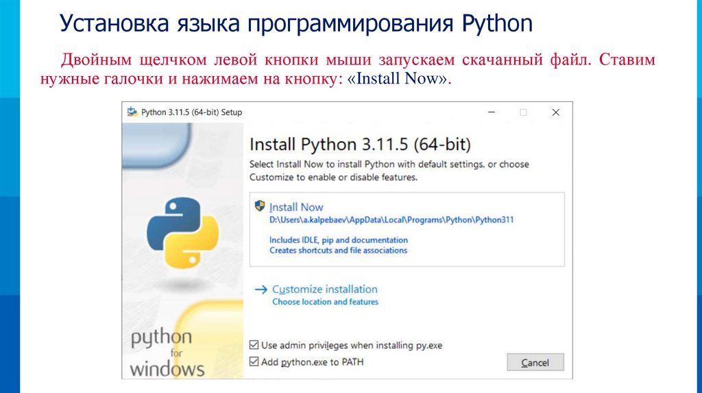 Установка языка программирования PythonДвойным щелчком левой кнопки мыши запускаем скачанный файл. Ставим