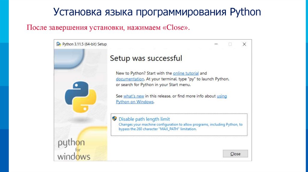 Установка языка программирования PythonПосле завершения установки, нажимаем «Close».