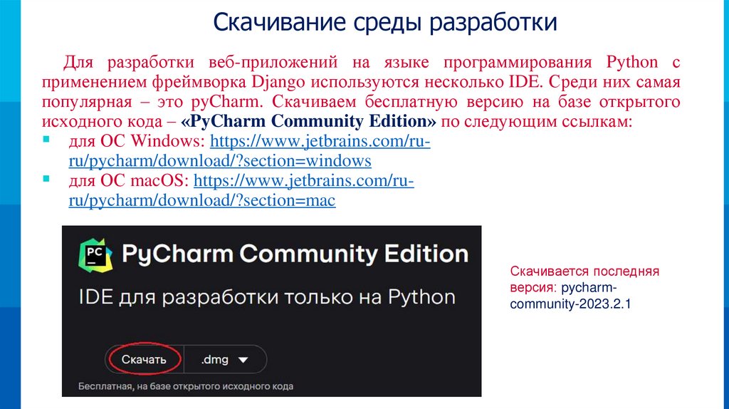 Скачивание среды разработкиДля разработки веб-приложений на языке программирования Python с