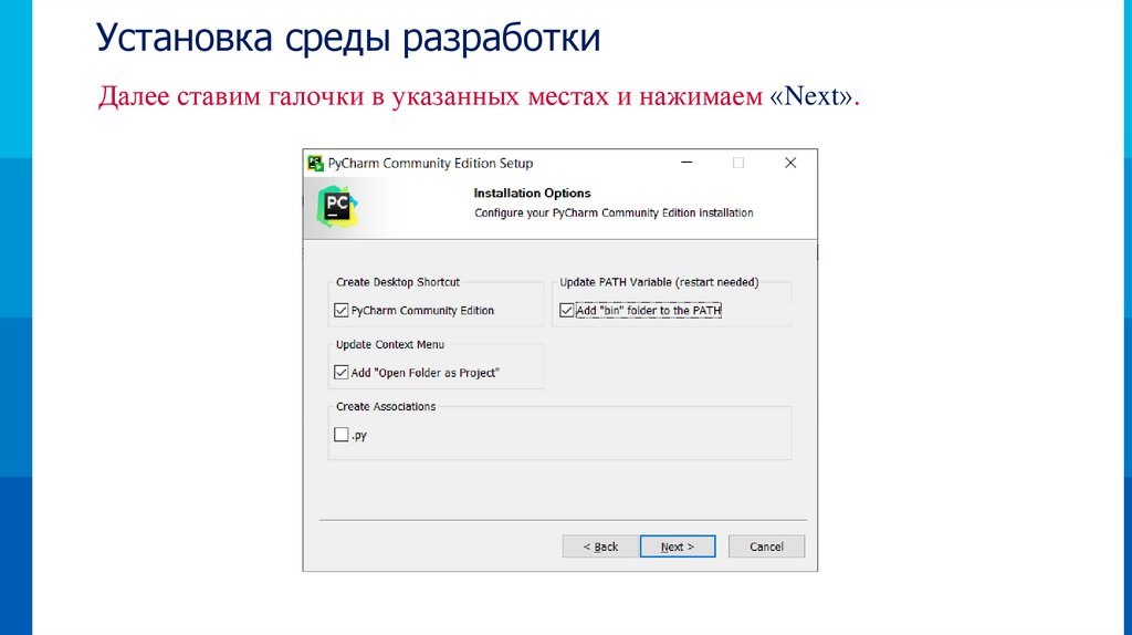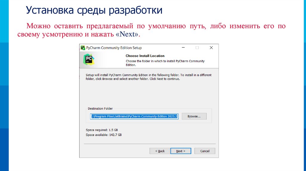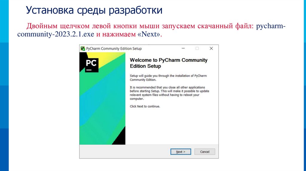 Установка среды разработкиДвойным щелчком левой кнопки мыши запускаем скачанный файл: pycharmcommunity-2023.2.1.exe и нажимаем «Next».