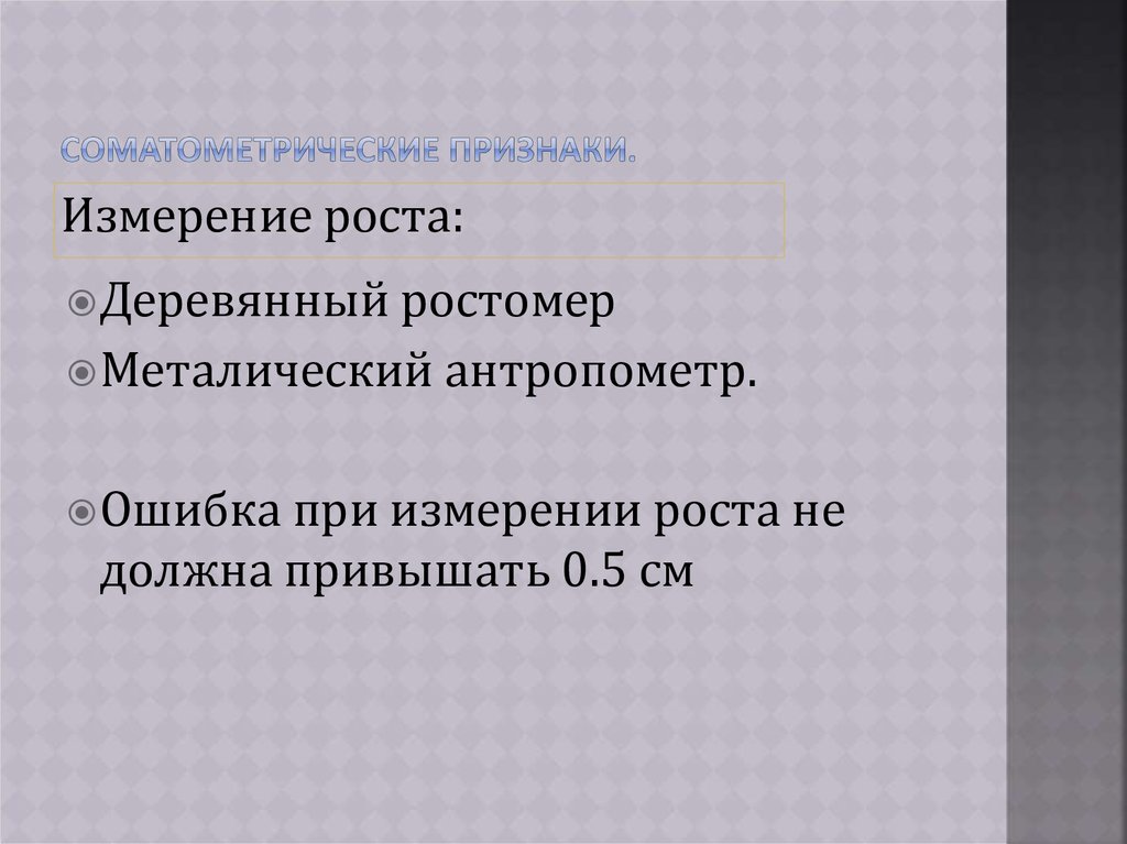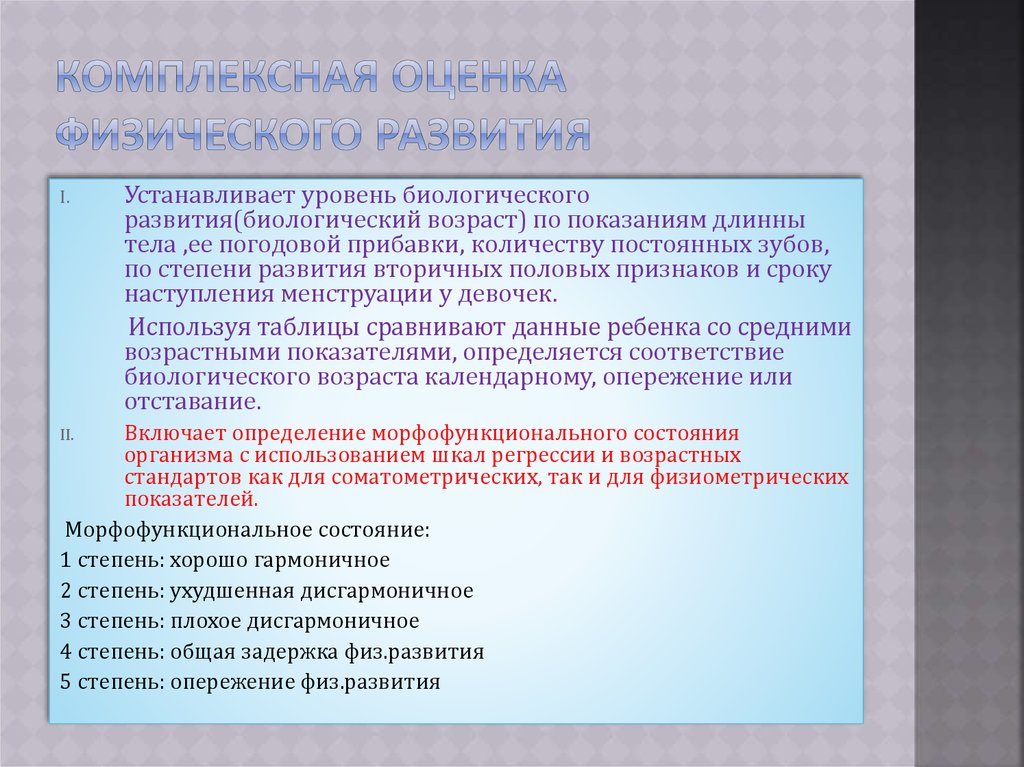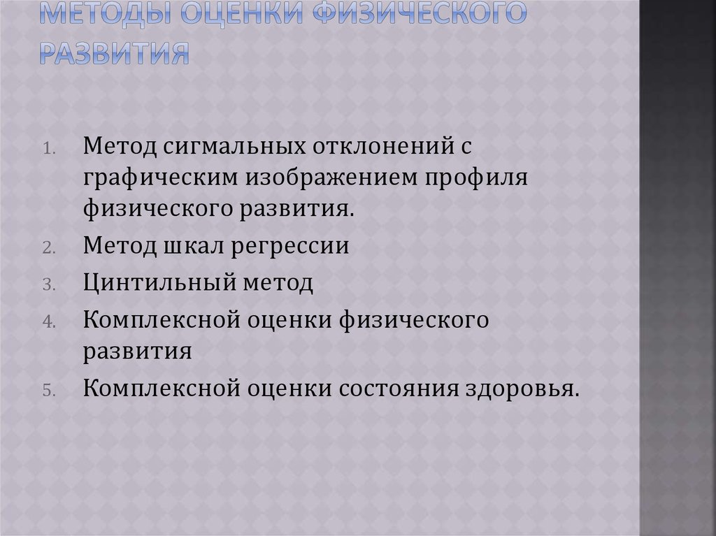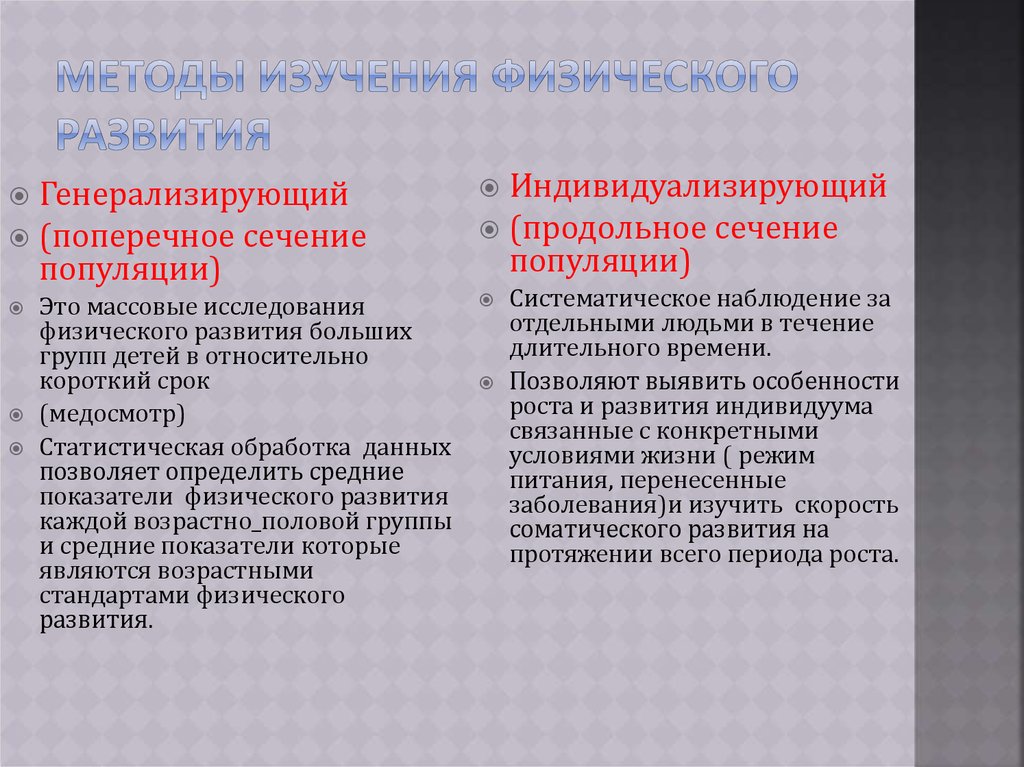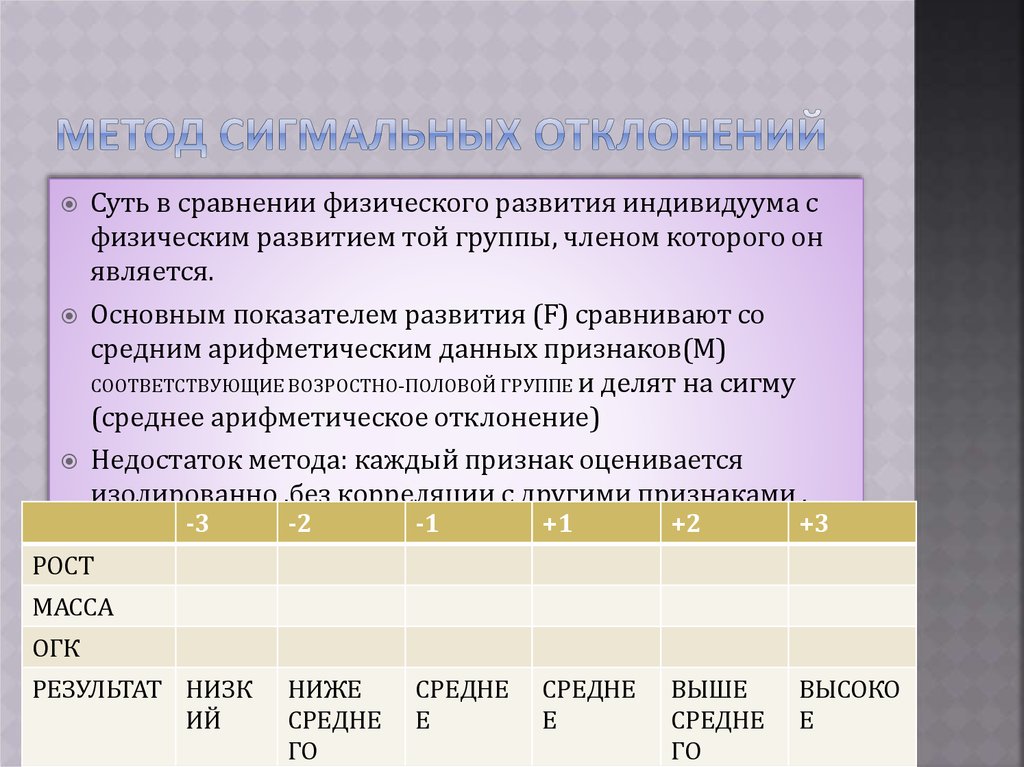 Суть в сравнении физического развития индивидуума сфизическим развитием той группы, членом которого он