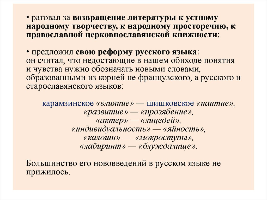 • Стремился к устранению из литературной речи тех