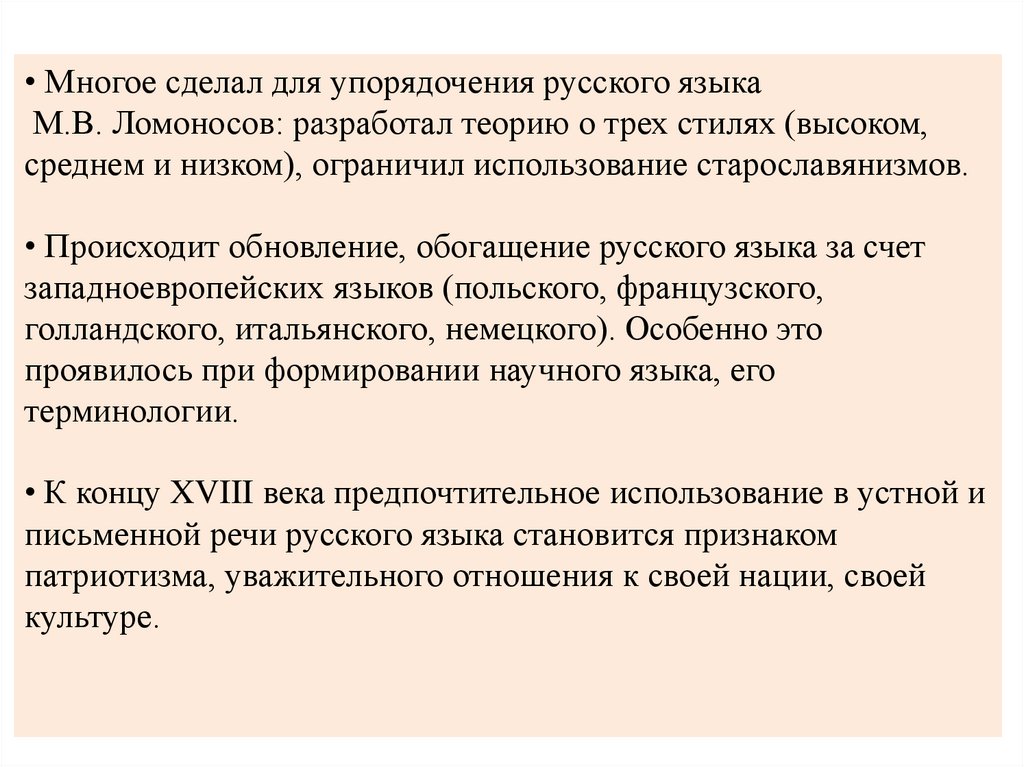 • Многое сделал для упорядочения русского языкаМ.В. Ломоносов: разработал теорию о трех стилях (высоком,