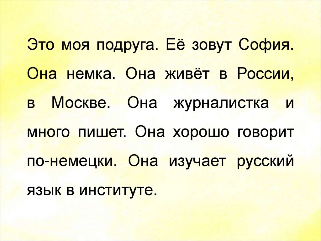 Это моя подруга. Её зовут София.Она немка. Она живёт в России,