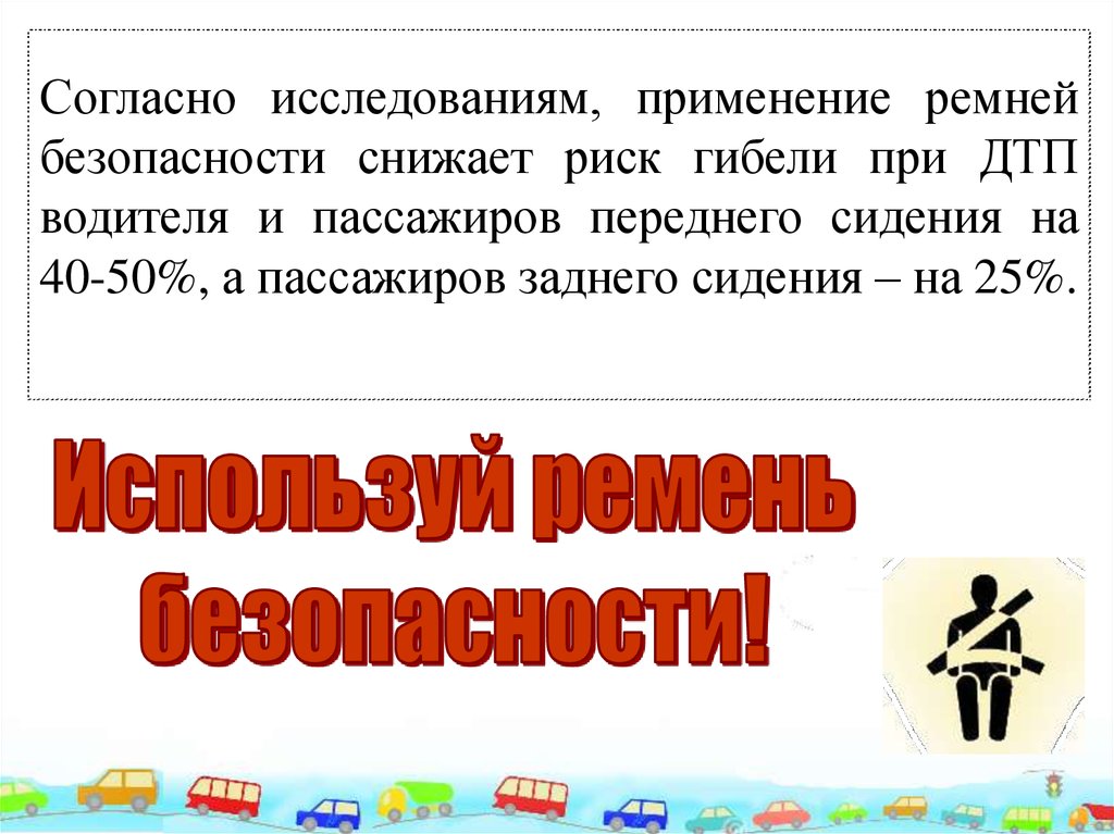 Согласно исследованиям, применение ремнейбезопасности снижает риск гибели при ДТП