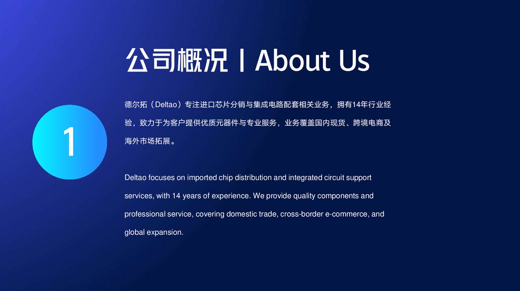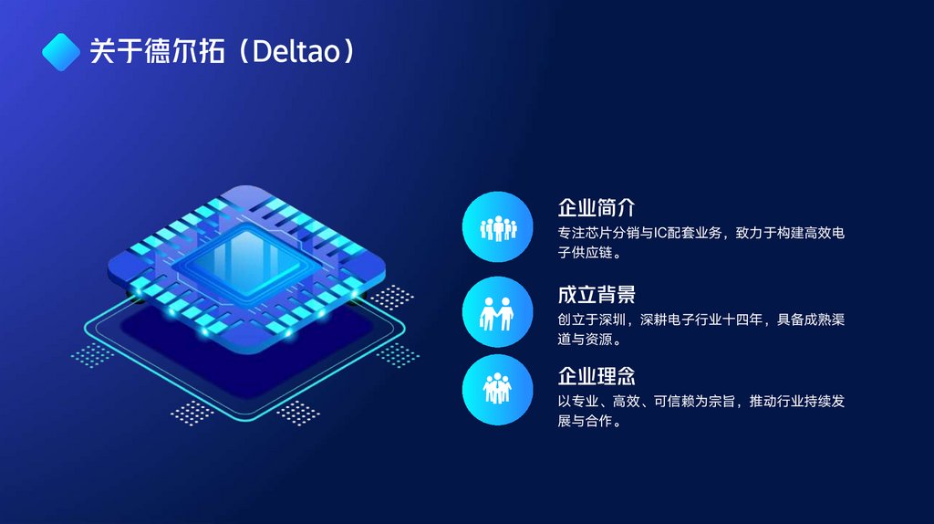 公司概况 About Us德尔拓 Deltao 专注进口芯片分销与集成电路配套相关业务 拥有14年行业经