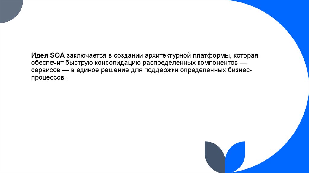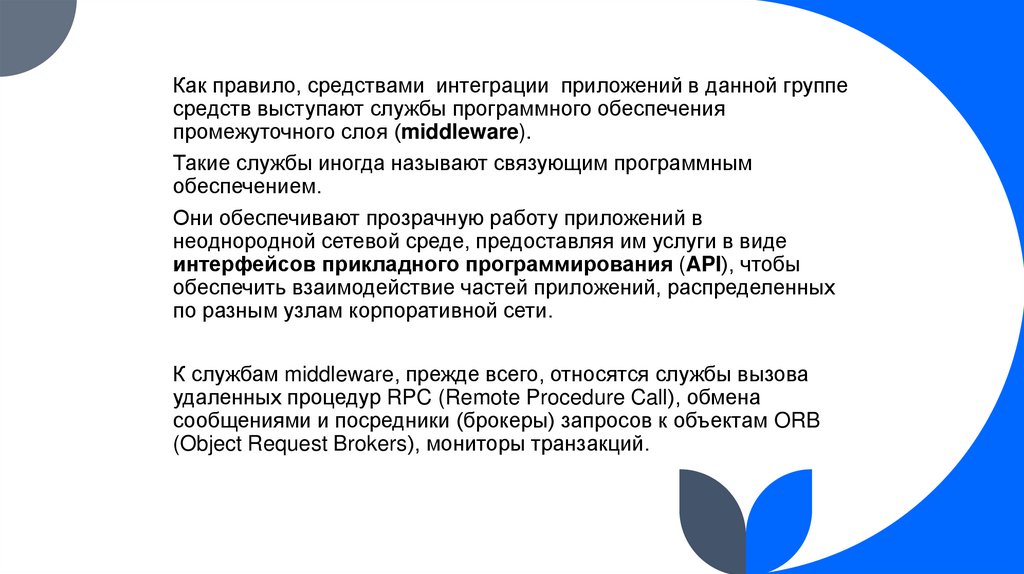 EAI (Enterprise application integration) – интеграционная программнаяструктура, объединяющий различного рода приложения, разработанные