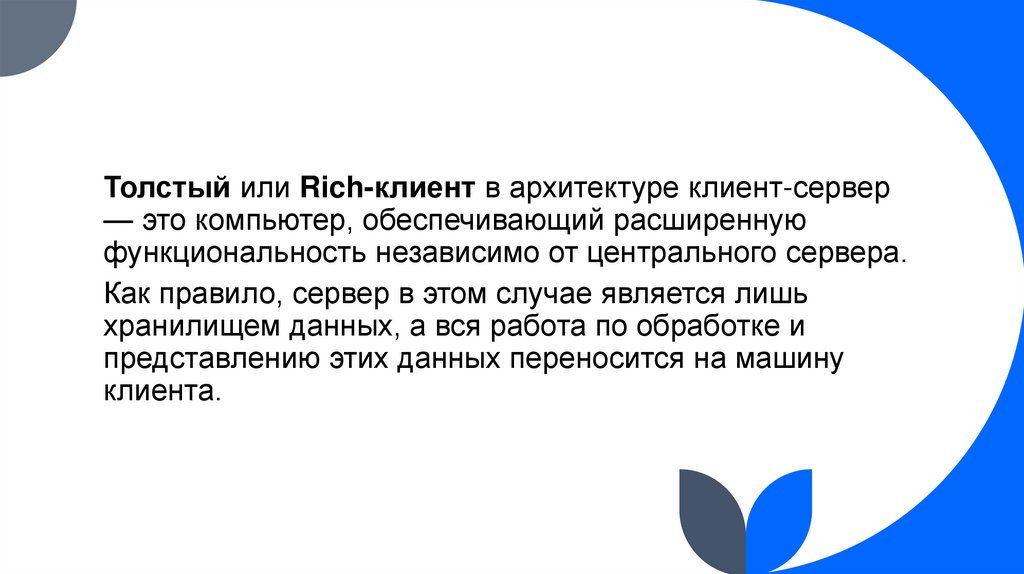 34. В настоящее время известны следующие реализации толстого клиента: