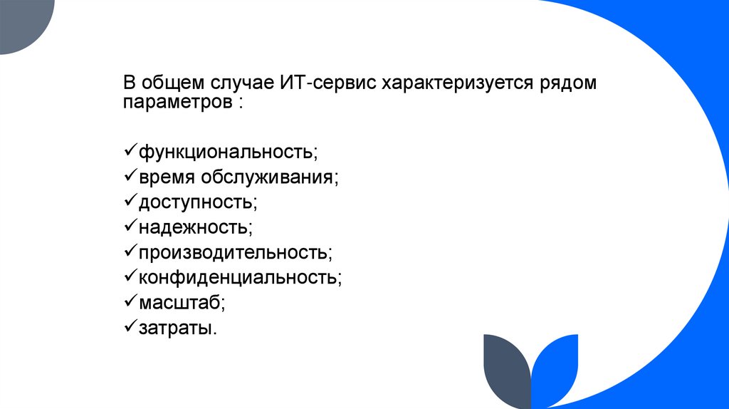 В общем случае ИТ-сервис характеризуется рядомпараметров :