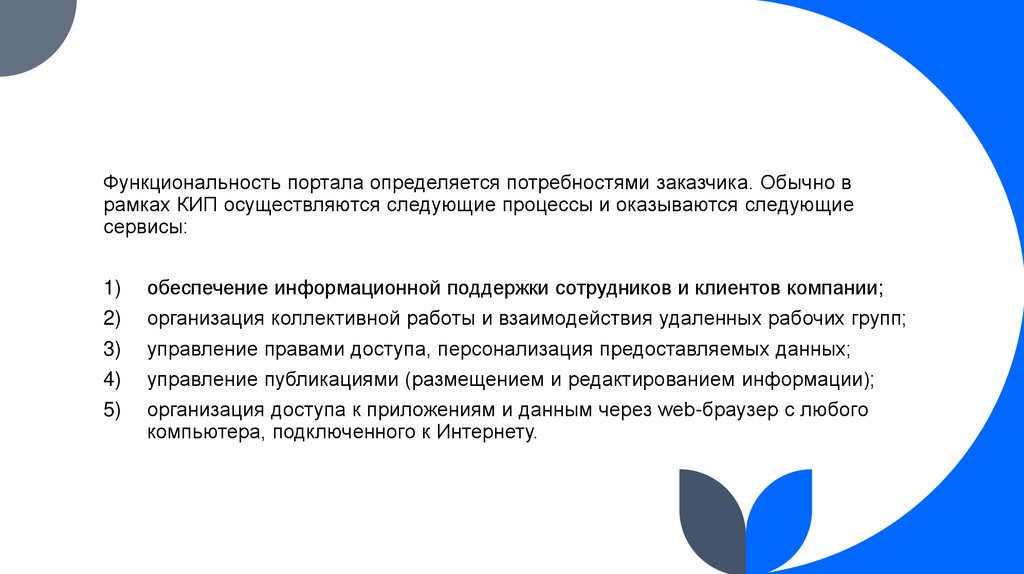 Функциональность портала определяется потребностями заказчика. Обычно врамках КИП осуществляются следующие процессы и оказываются следующие