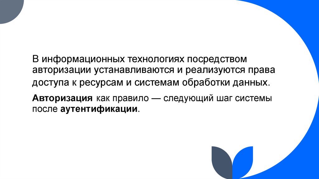 В информационных технологиях посредствомавторизации устанавливаются и реализуются права
