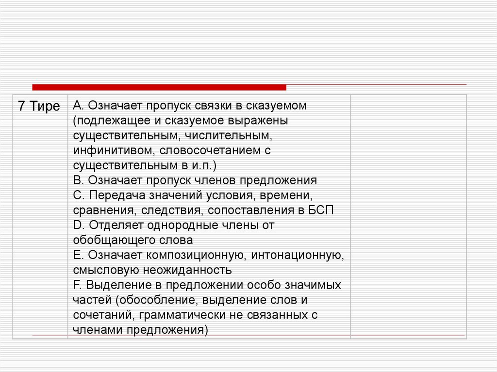 7 Тире A. Означает пропуск связки в сказуемом(подлежащее и сказуемое выражены