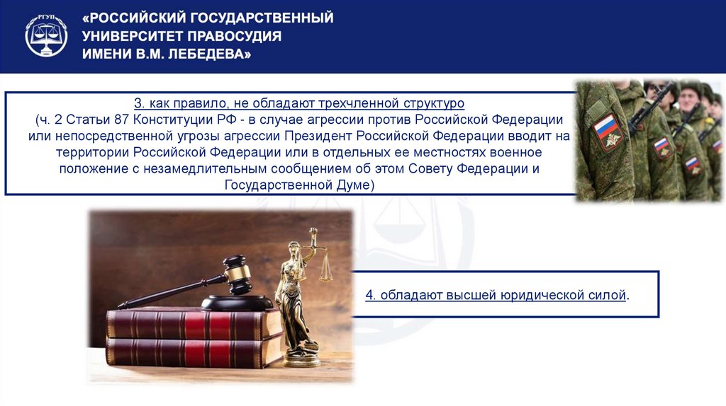 3. как правило, не обладают трехчленной структуро(ч. 2 Статьи 87 Конституции РФ - в случае агрессии против Российской Федерации