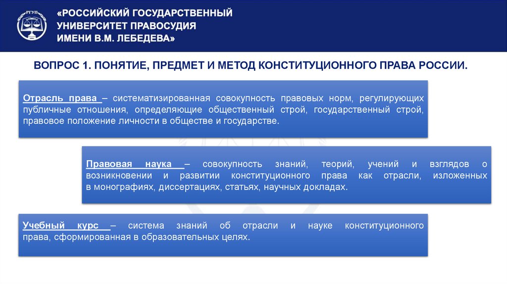 ВОПРОС 1. ПОНЯТИЕ, ПРЕДМЕТ И МЕТОД КОНСТИТУЦИОННОГО ПРАВА РОССИИ.Отрасль права – систематизированная совокупность правовых норм, регулирующих