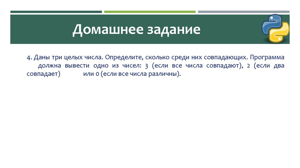Домашнее задание4. Даны три целых числа. Определите, сколько среди них совпадающих. Программа