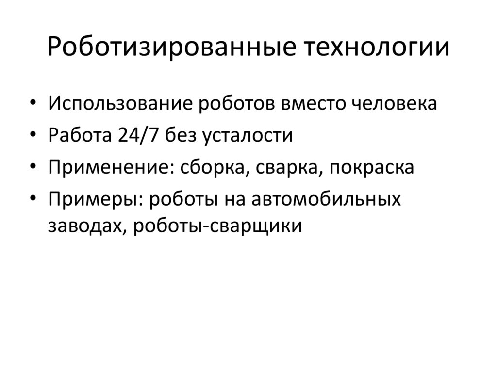Роботизированные технологии• Использование роботов вместо человека