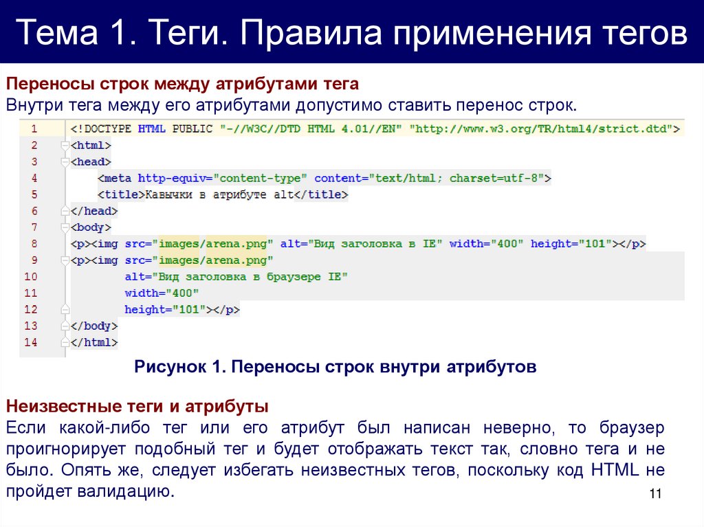 Тема 1. Теги. Правила применения теговПереносы строк между атрибутами тега