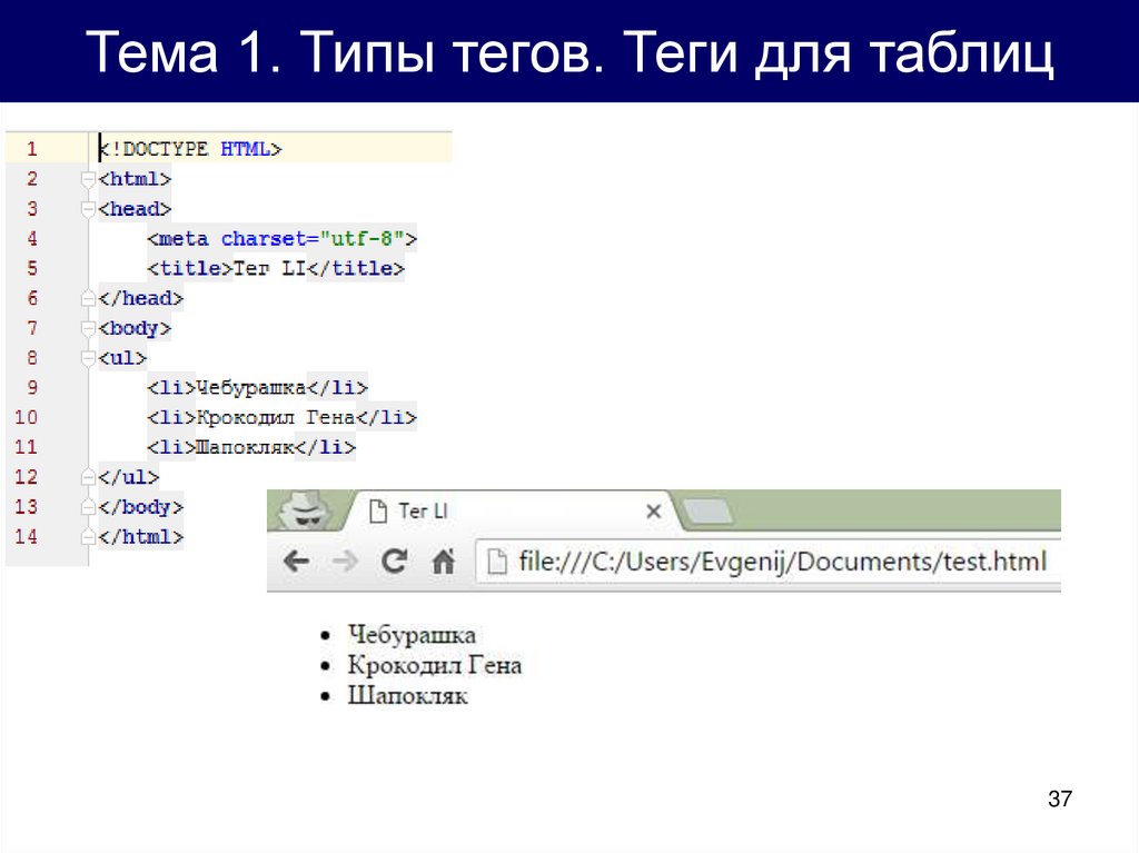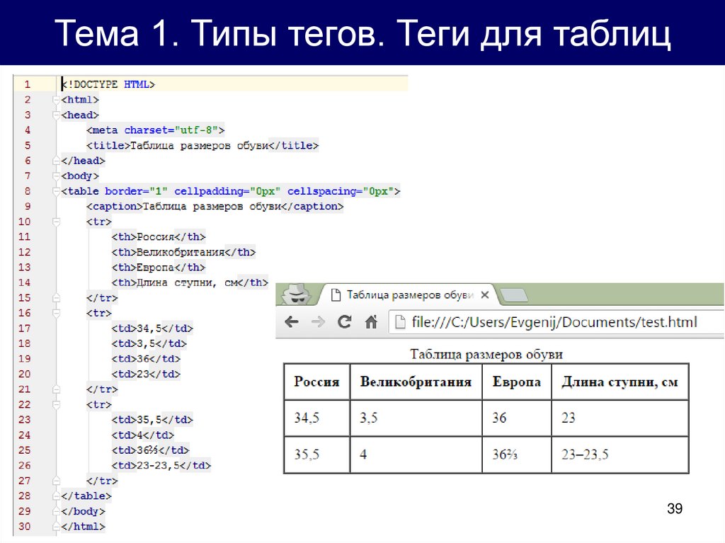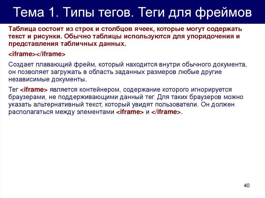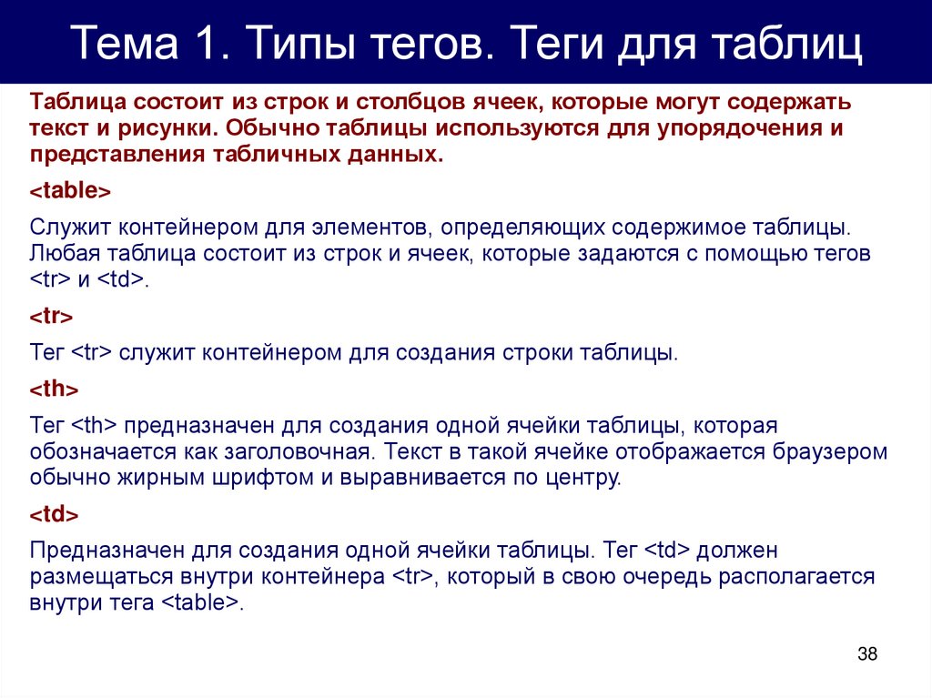 Тема 1. Типы тегов. Теги для фреймовТаблица состоит из строк и столбцов ячеек, которые могут содержать
