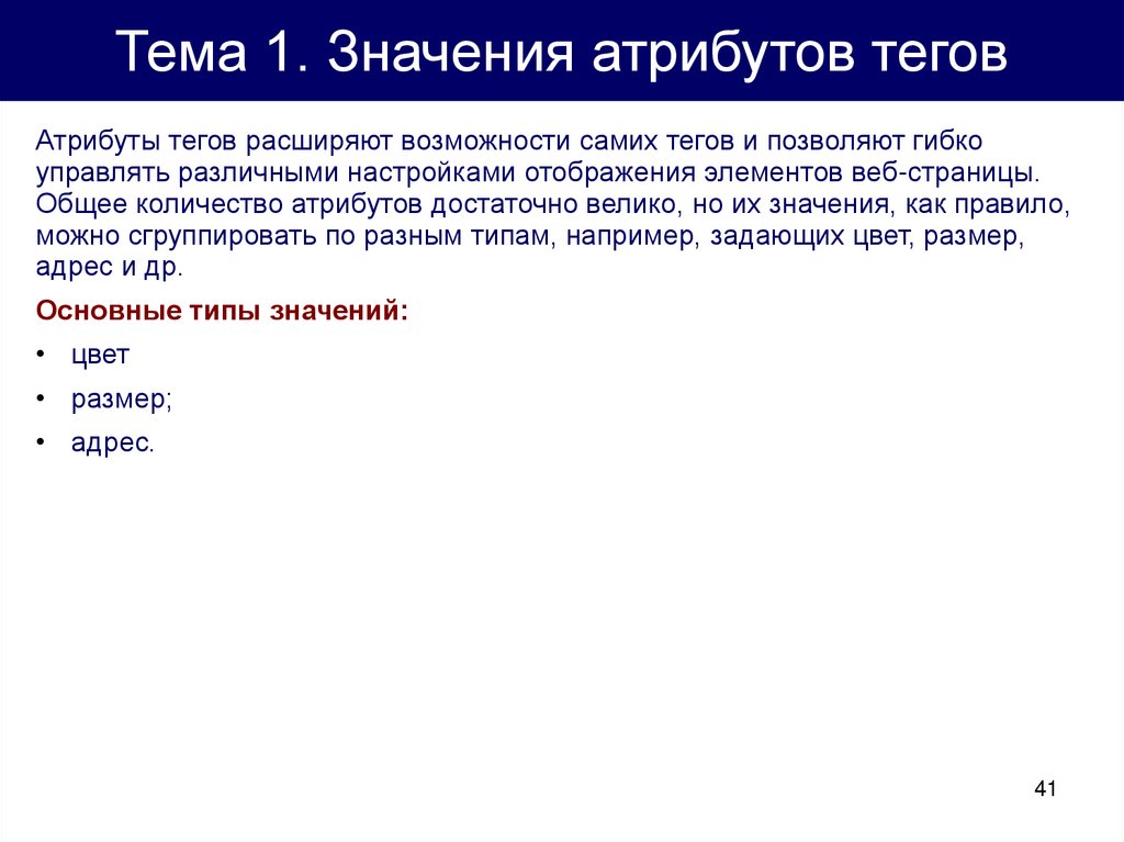 Тема 1. Значения атрибутов теговАтрибуты тегов расширяют возможности самих тегов и позволяют гибко