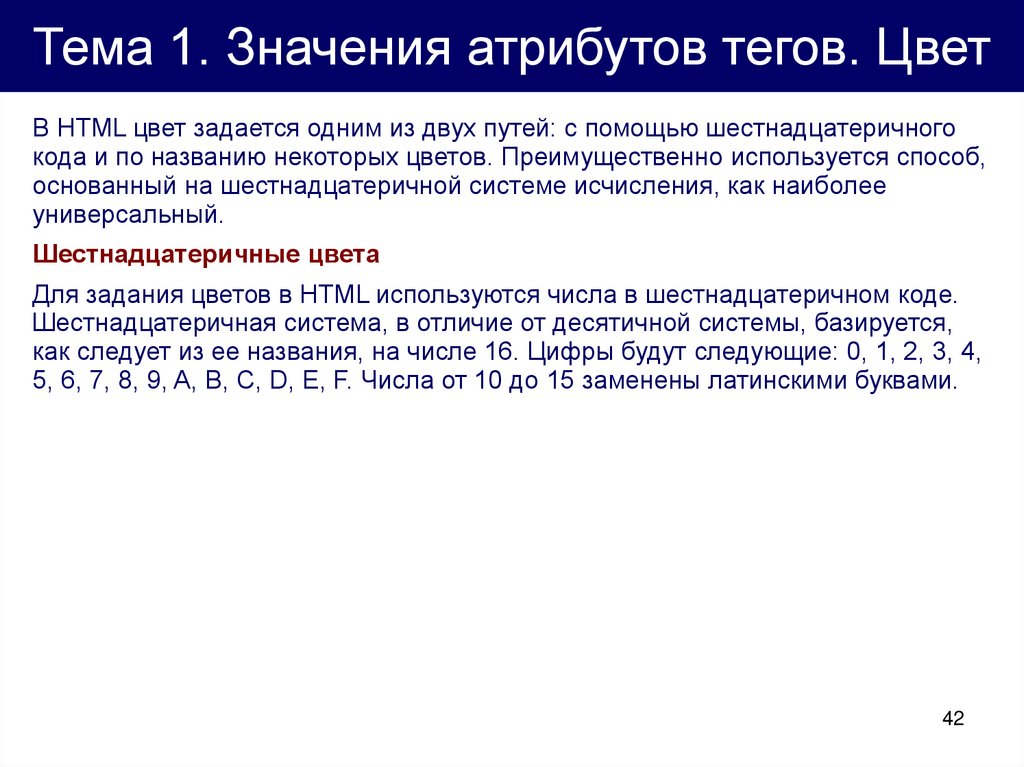 Тема 1. Значения атрибутов тегов. ЦветВ HTML цвет задается одним из двух путей: с помощью шестнадцатеричного