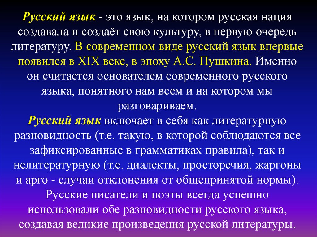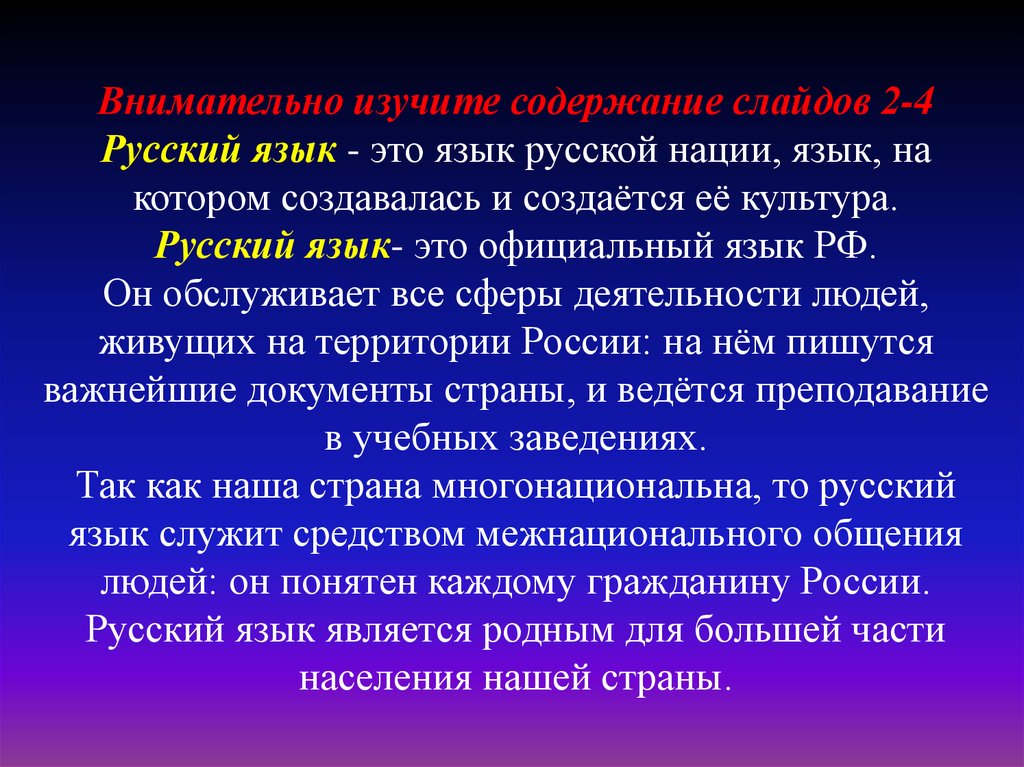 Внимательно изучите содержание слайдов 2-4Русский язык - это язык русской нации, язык, на