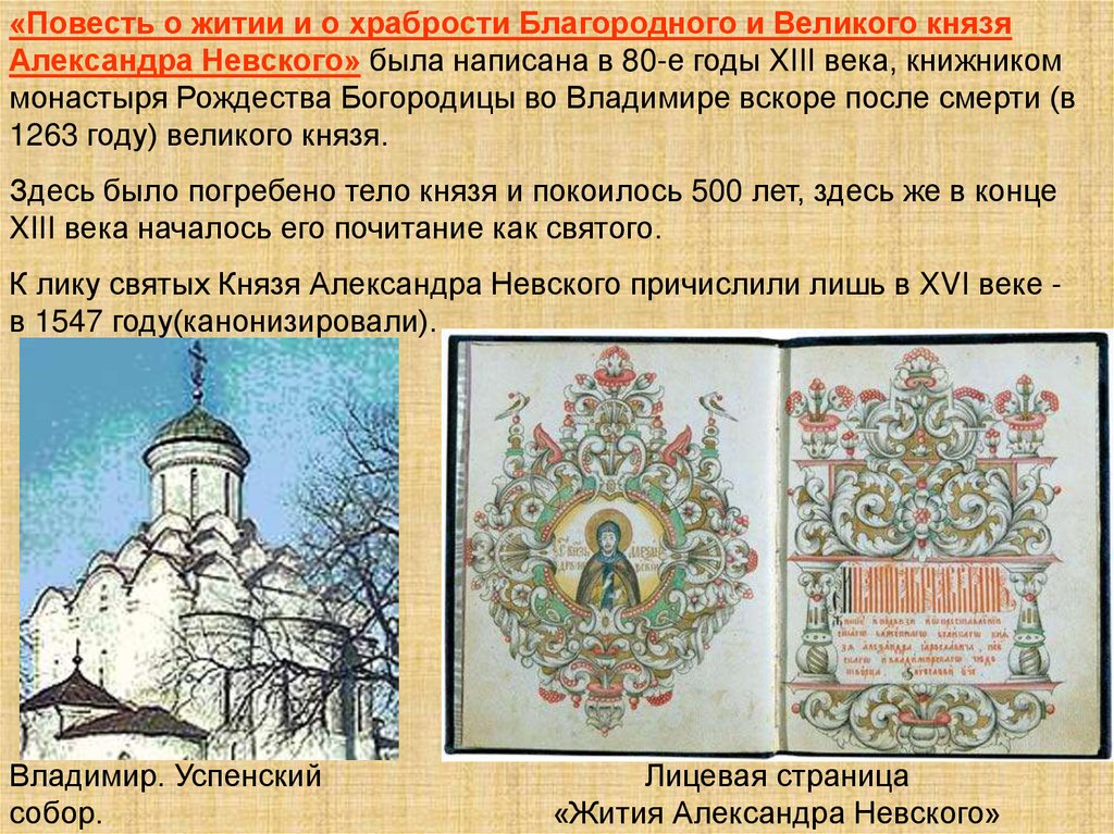 «Повесть о житии и о храбрости Благородного и Великого князяАлександра Невского» была написана в 80-е годы XIII века, книжником