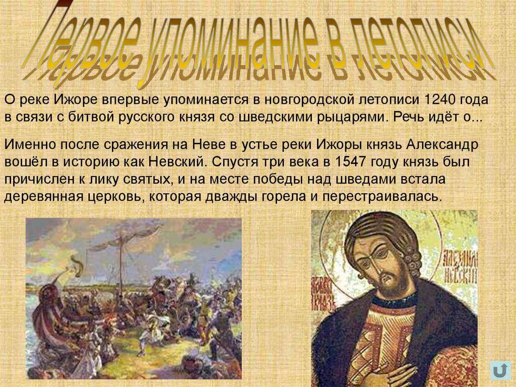 О реке Ижоре впервые упоминается в новгородской летописи 1240 годав связи с битвой русского князя со шведскими рыцарями. Речь идёт о...