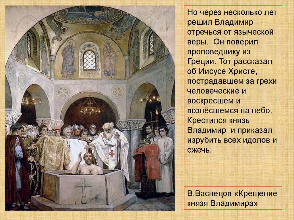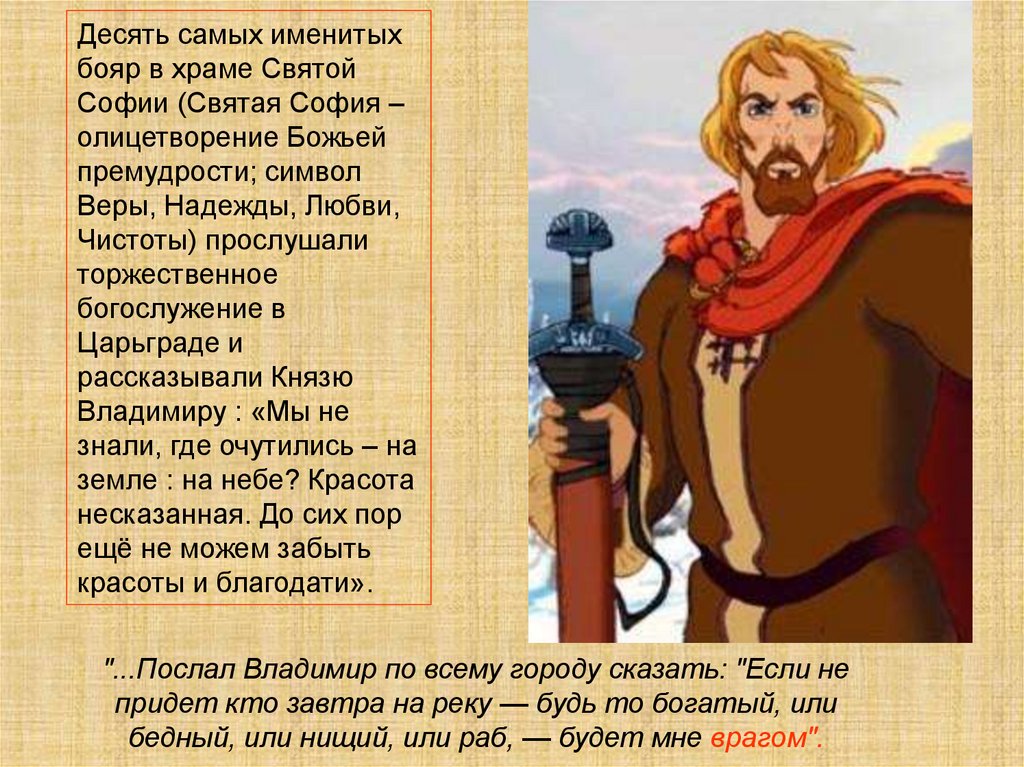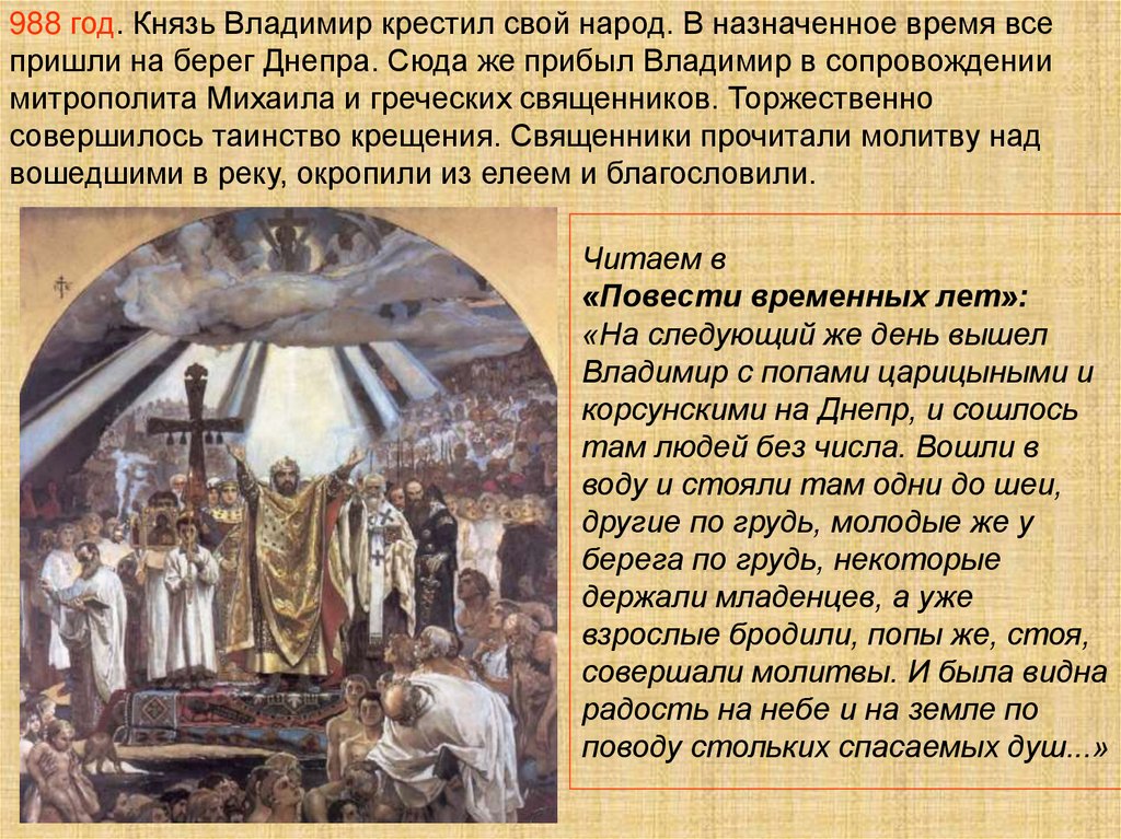 988 год. Князь Владимир крестил свой народ. В назначенное время всепришли на берег Днепра. Сюда же прибыл Владимир в сопровождении