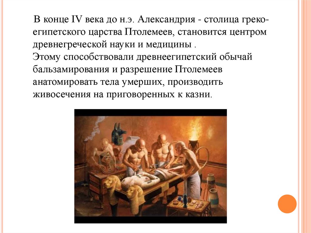 В конце IV века до н.э. Александрия - столица грекоегипетского царства Птолемеев, становится центромдревнегреческой науки и медицины .
