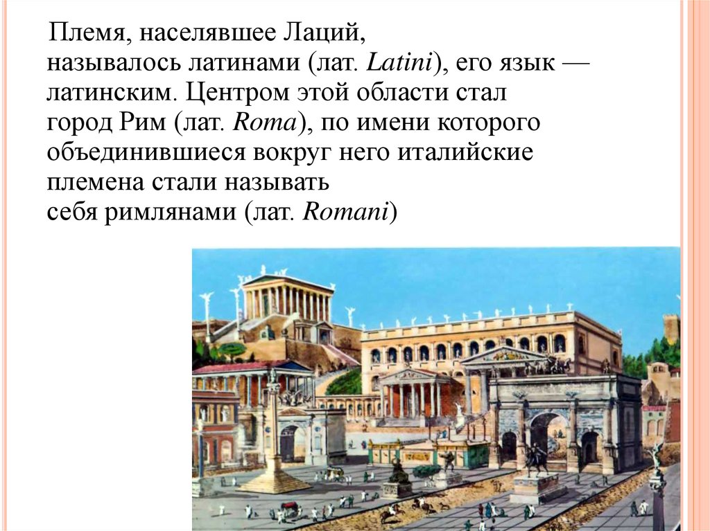 Племя, населявшее Лаций,называлось латинами (лат. Latini), его язык —