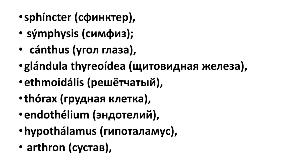 • sphíncter (сфинктер),• sýmphysis (симфиз);