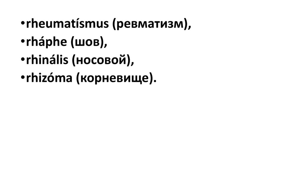 •rheumatísmus (ревматизм),•rháphe (шов),