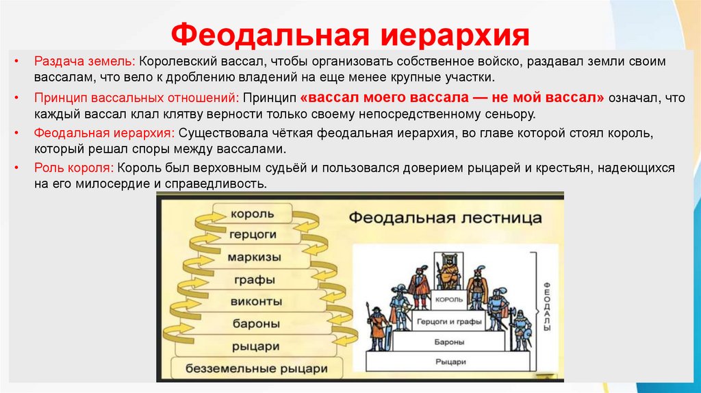 Феодальная иерархияРаздача земель: Королевский вассал, чтобы организовать собственное войско, раздавал земли своим