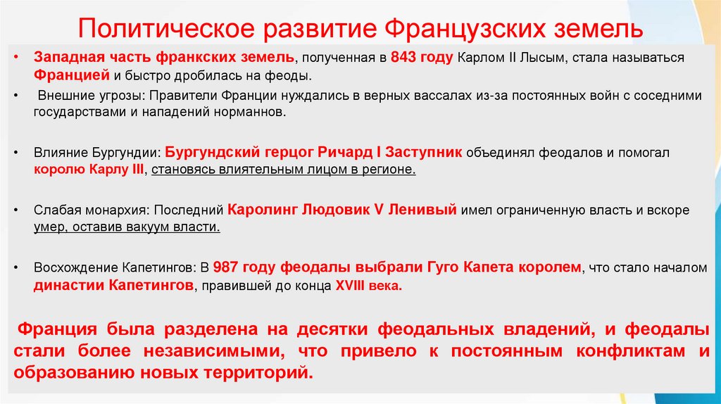 Политическое развитие Французских земель• Западная часть франкских земель, полученная в 843 году Карлом II Лысым, стала называться